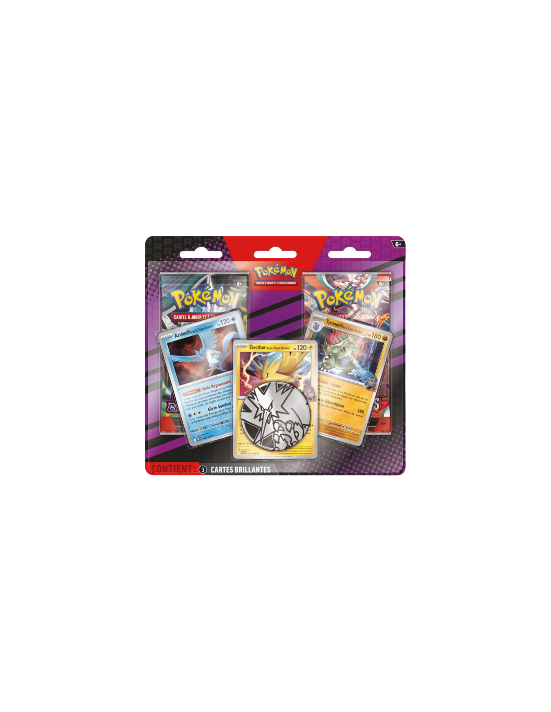 trois cartes brillantes du JCC Pokémon d'Artikodin de la Team Rocket, Électhor de la Team Rocket et Tyranocif de la Team Rocket, plus une pièce métallisée et deux boosters du JCC Pokémon.