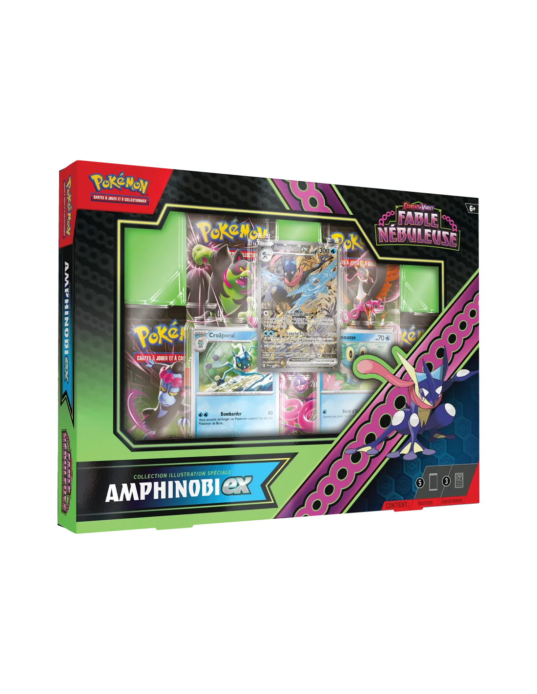 Collection Illustration spéciale Écarlate et Violet – Fable Nébuleuse – Amphinobi-ex (2 août 2024) : 5 boosters, une carte promo "illustration spéciale rare" d’Amphinobi-ex en style Ukiyo-e, et 2 cartes promo brillantes de Grenousse et Croâporal.