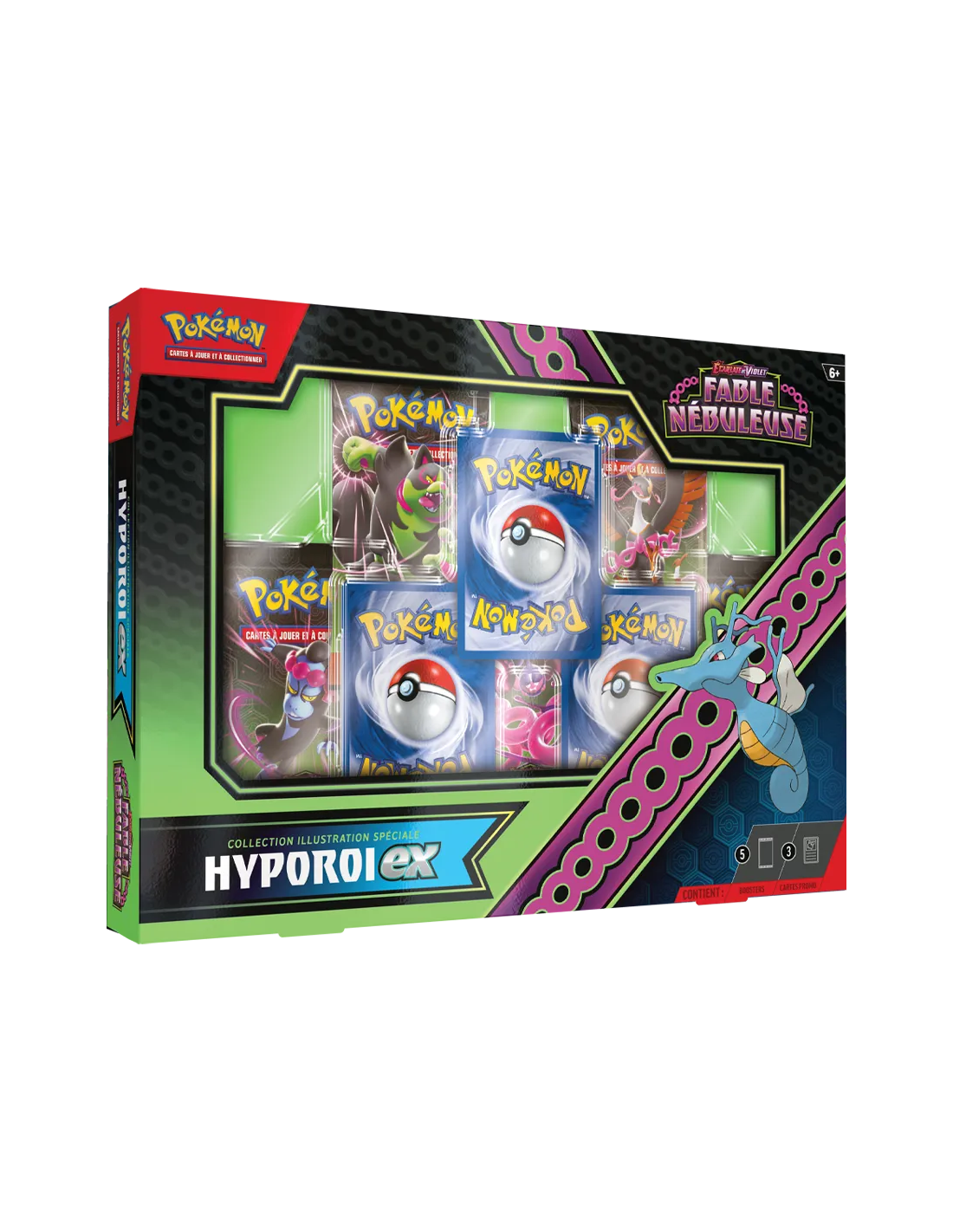 Découvrez le magnifique coffret Pokémon Hyporoi EX Collection Illustration spéciale Écarlate et Violet – Fable Nébuleuse – Hyporoi-ex (2 août 2024) : 5 boosters, une carte promo "illustration spéciale rare" d’Hyporoi-ex en style Ukiyo-e, et 2 cartes promo brillantes d’Hypotrempe et Hypocéan.